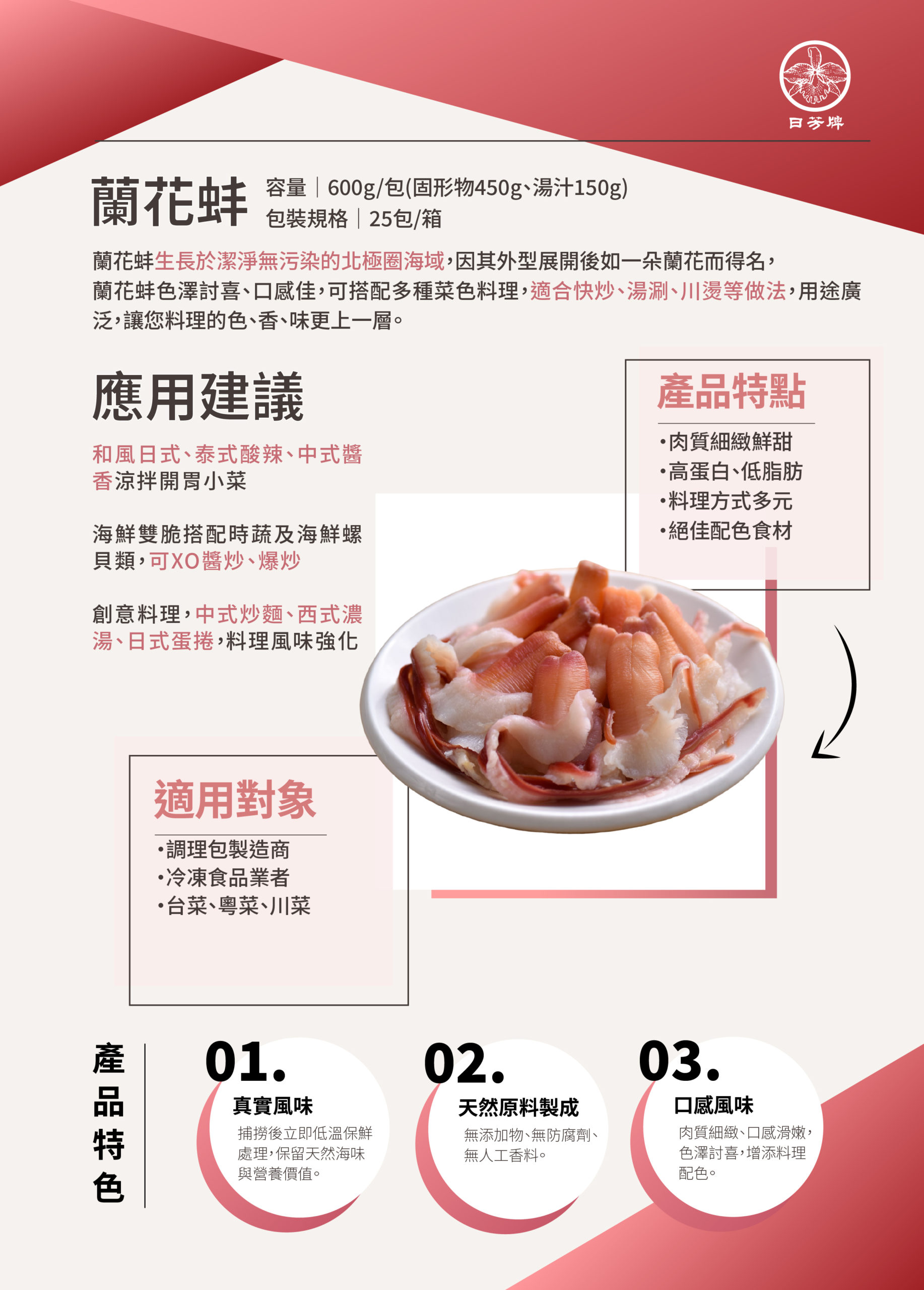 蘭花蚌生長於潔淨無污染的北極圈海域,因其外型展開後如一朵蘭花而得名,蘭花蚌色澤討喜、口感佳,可搭配多種菜色料理,適合快炒、湯涮、川燙等做法,用途廣泛,讓您料理的色、香、味更上一層。